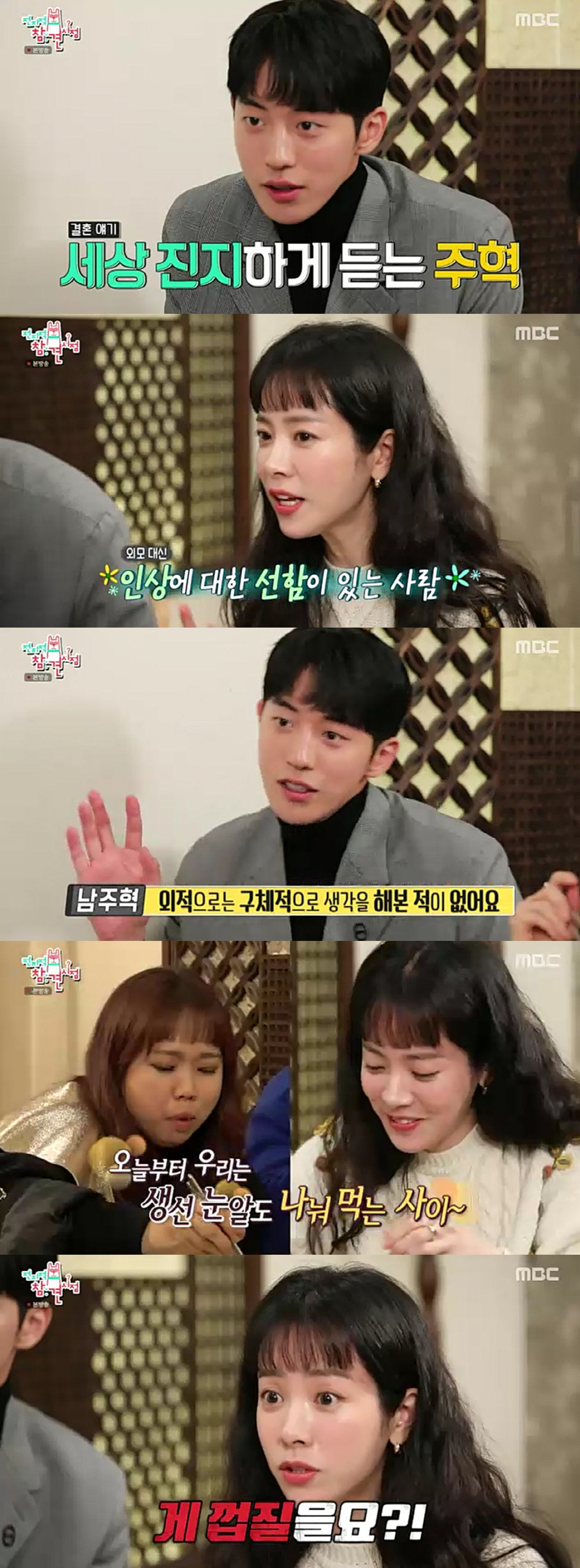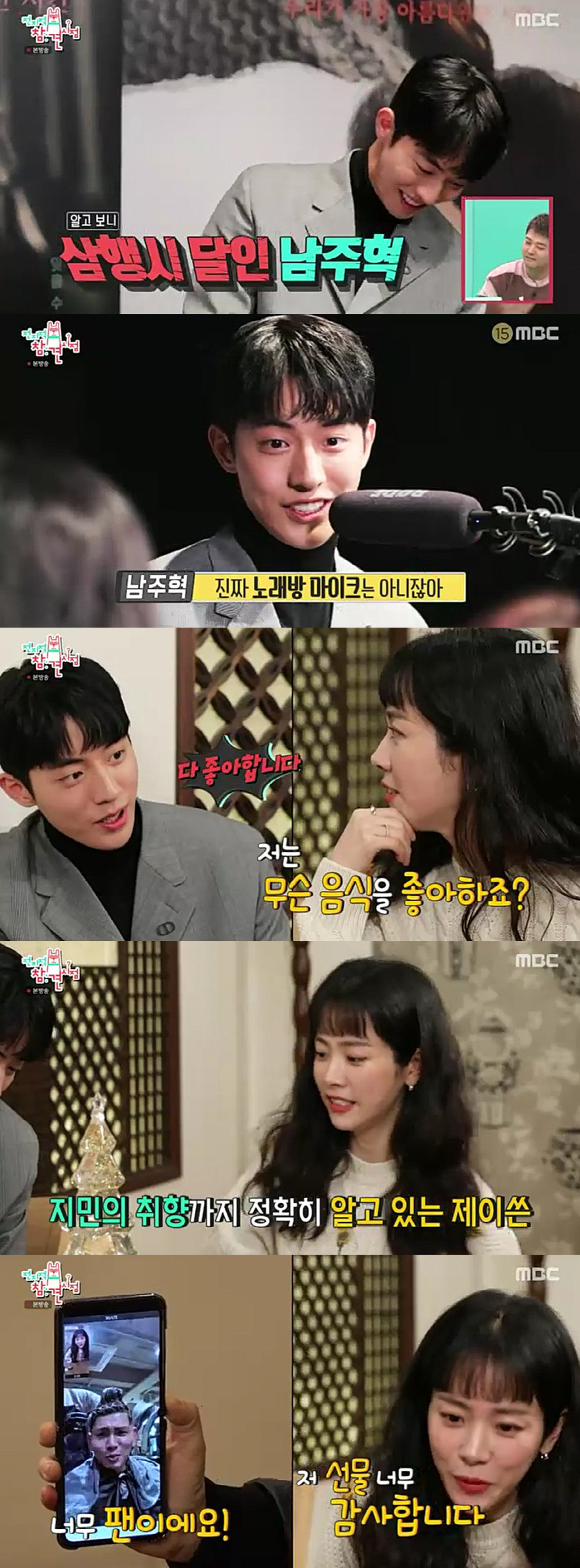 재첩국과 낙지 등 해물 메뉴가 차려졌다. '전참시'를 자주 본다는 두 사람. 남주혁은 특히 제이쓴이 매니저로 활약했던 회차에서 제이쓴이 홍현희의 키스를 거절한 장면이 웃겼다고 언급했다. 남주혁은 "그때 왜 (제이쓴이) 철벽 쳤던 거냐"고 물었고 홍현희는 "모르겠다. 연애할 때가 좋은 거지 결혼하니까 변하더라"라고 밝혔다.