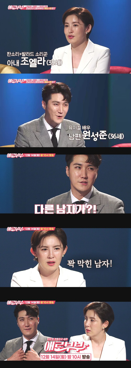 [스포츠조선닷컴 박아람 기자] SKY와 채널A가 공동 제작하는 본격 19금 부부 토크쇼 '다시 뜨거워지고 싶은 애로부부(이하 애로부부)'에서 3살 차이 '연상연하 부부'인 소리꾼 조엘라&뮤지컬 배우 원성준이 흔하지만 예민한 문제 '아내의 남사친'을 두고 갑론을박을 벌인다.