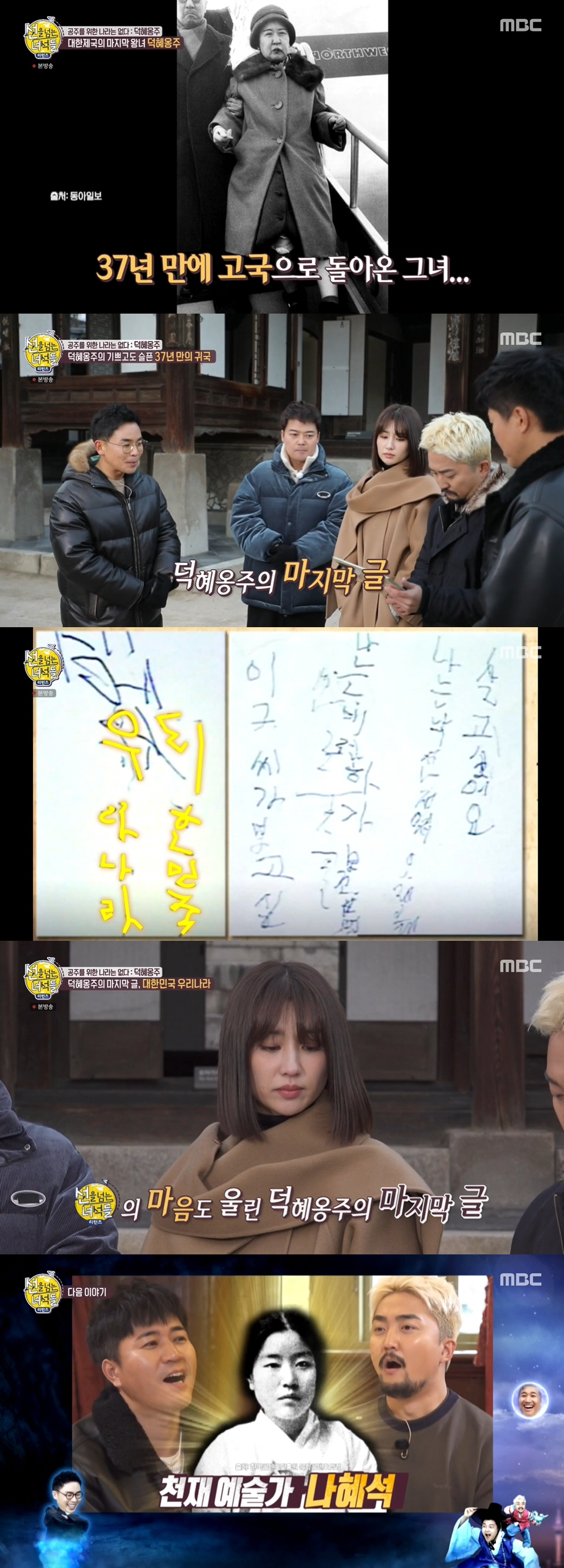 [스포츠조선닷컴 김준석 기자] '선을 넘는 녀석들'의 마음을 울린 덕혜옹주의 마지막 낙서는 "대한민국 우리나라"였다.
