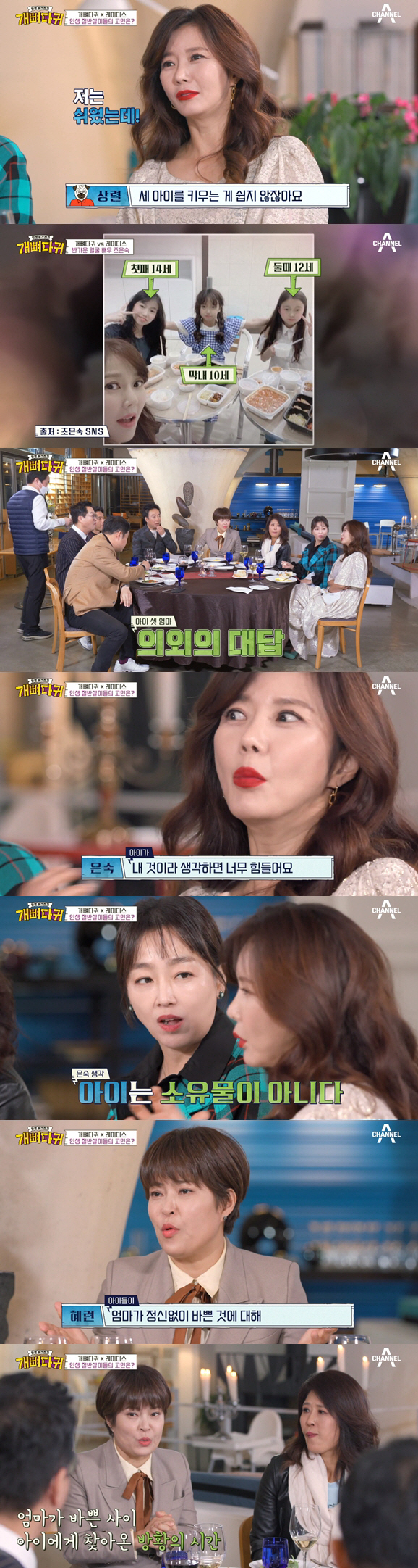 이에 조은숙은 "저는 쉬웠다. 계속 낳고 싶을 정도"라고 밝혀 놀라움을 자아냈다. 이어 "아이가 내 것이라 생각하면 힘들다. '내 품에 꼭 있어야 돼' '내가 모든 걸 주관해야 돼' 이런 게 아니라 아이는 그저 나에게 온 선물이, 스스로 하나하나 풀어나갈 수 있도록 해줘야 한다"고 교육관을 밝혀 공감을 샀다.