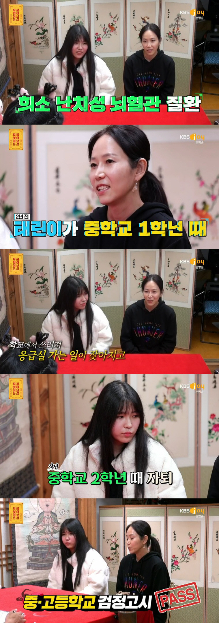 송수은 씨는 딸 송태린 양이 뇌혈관 질환인 모야모야병을 앓고 있다고 설명했다. 보통 사람에 비해 혈관이 좁아 다른 사람보다 뇌출혈, 뇌경색 발병 가능성이 높다고. 송수은 씨는 "중학교 1학년 때 병을 발견했다. 수술을 했는데 학교 다니기 힘들었다. 쓰러져서 응급실 가는 일이 많아져서 중학교 2학년 때 자퇴하고 고등학교 검정고시를 봤다. 공부를 정말 열심히 했다"고 자퇴 후 독학으로 고등학교 졸업을 이미 한 상태라고 밝혔다.