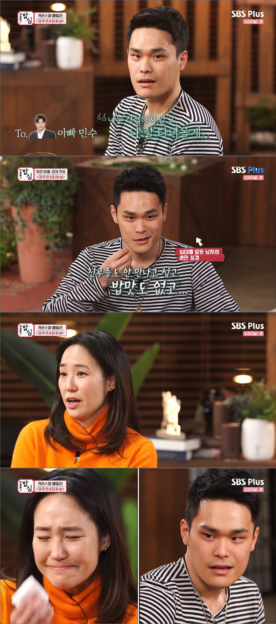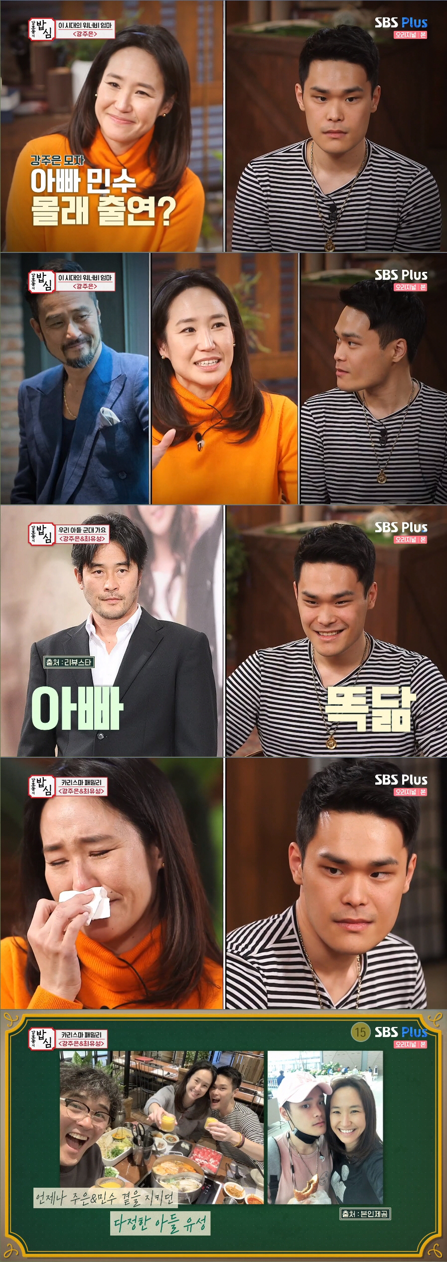 강주은은 "아들을 처음으로 군대가는 상황 아니냐. 3년 전부터 (최민수가) 신경을 썼다. 말을 안해도 느끼지 않냐. 이 방송은 몰래 아빠를 위한 깜짝 선물인 거다"라고 덧붙였다. 최민수 몰래 방송에 나왔다고 밝힌 두 모자는 '걸릴 뻔 한적 있냐'는 질문에 "엄마가 대본을 보는데 아빠가 나타났다. 엄마가 급하게 대본을 뒤집는 걸 봤다"고 증언했다.