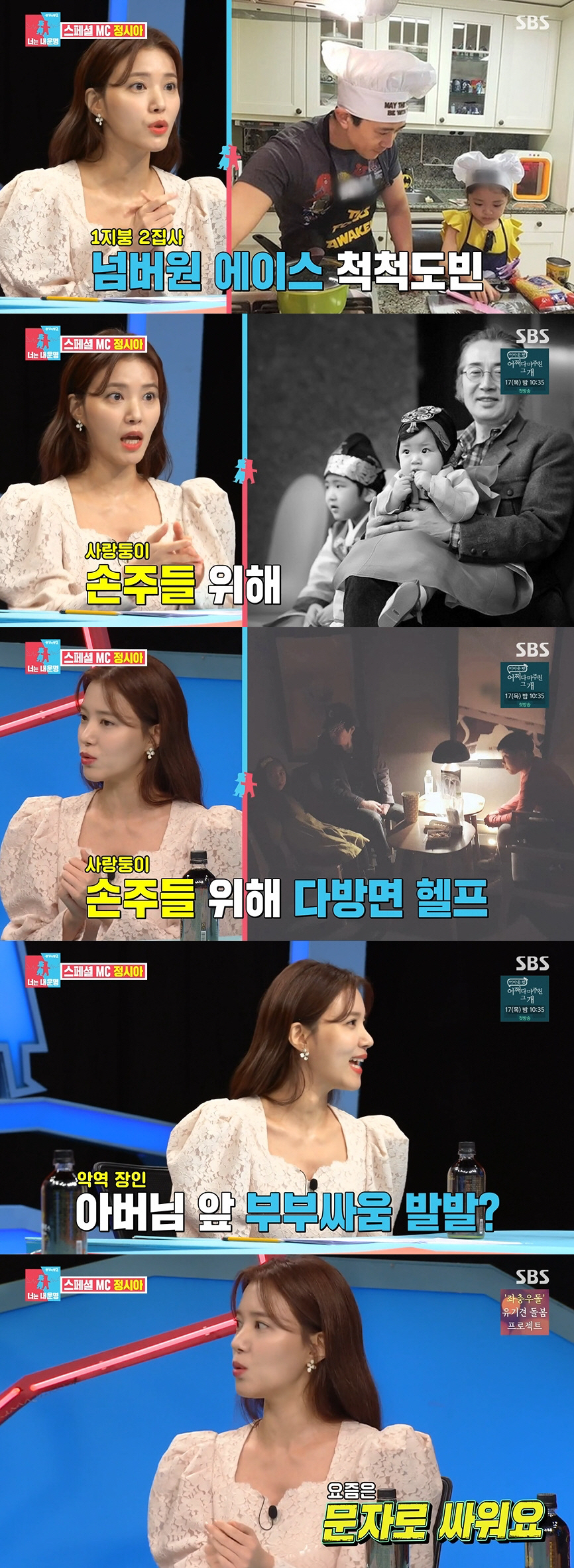 정시아는 "신랑이 단순히 요리하는 것뿐만 아니라 되게 세세하게 살림에 신경을 쓰는 스타일"이라며 "요즘은 아버님도 살림꾼으로 거듭나고 계시다. 아이들 장난감 소독부터 분리수거, 빨래까지 다 깔끔하게 개는 등 정말 많이 도와주신다"고 말했다.