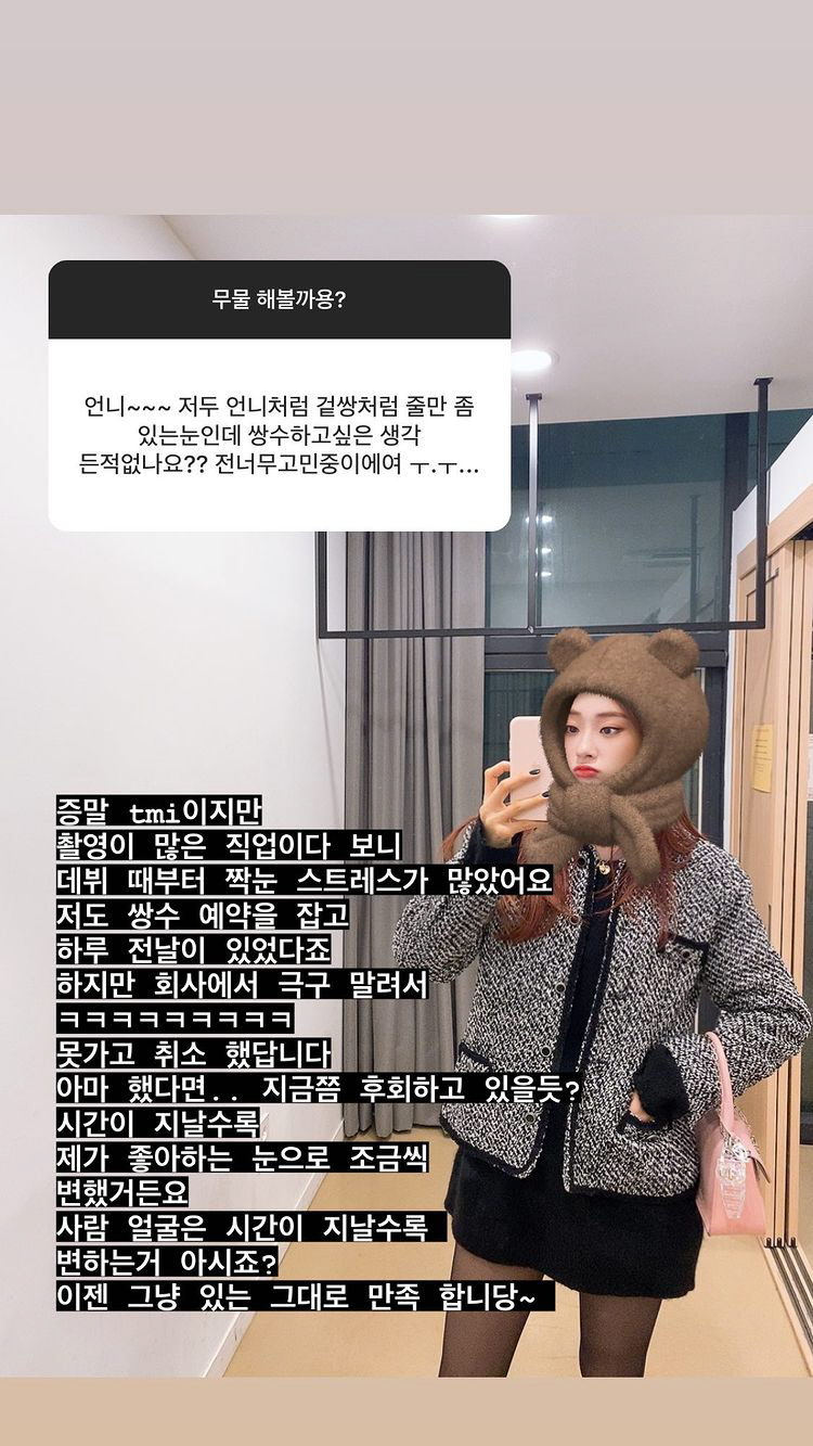 이에 경리는 "정말 tmi지만 촬영이 많은 직업이다 보니 데뷔 때부터 짝눈 스트레스가 많았다. 저도 쌍수 예약을 잡고 하루 전날 회사에서 극구 말려서 못 가고 취소했다"고 답했다.