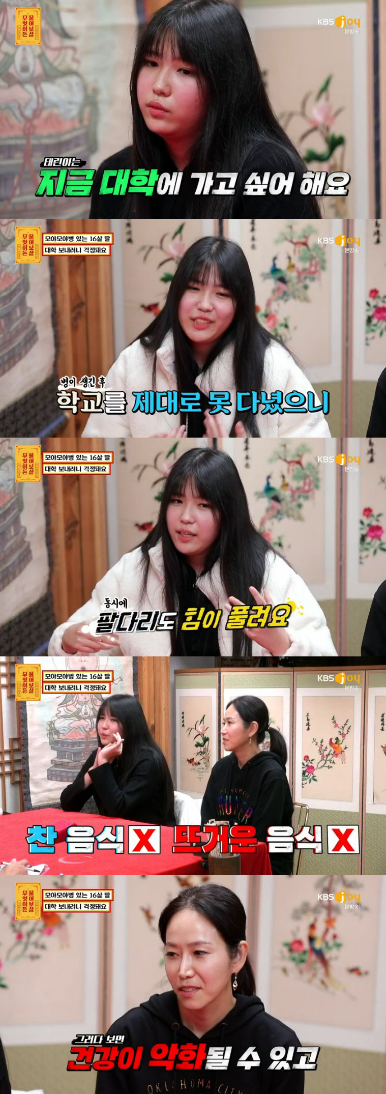 고등학교를 이미 졸업한 상태라 바로 대학 진학도 가능하지만 송수은 씨는 딸이 건강하게 대학을 다닐 수 있을 지가 걱정이었다. 송수은 씨는 "아직 애가 어리니까 20살 때 대학을 갔음 좋겠는데 지금 당장 가고 싶다고 한다"고 털어놨다.