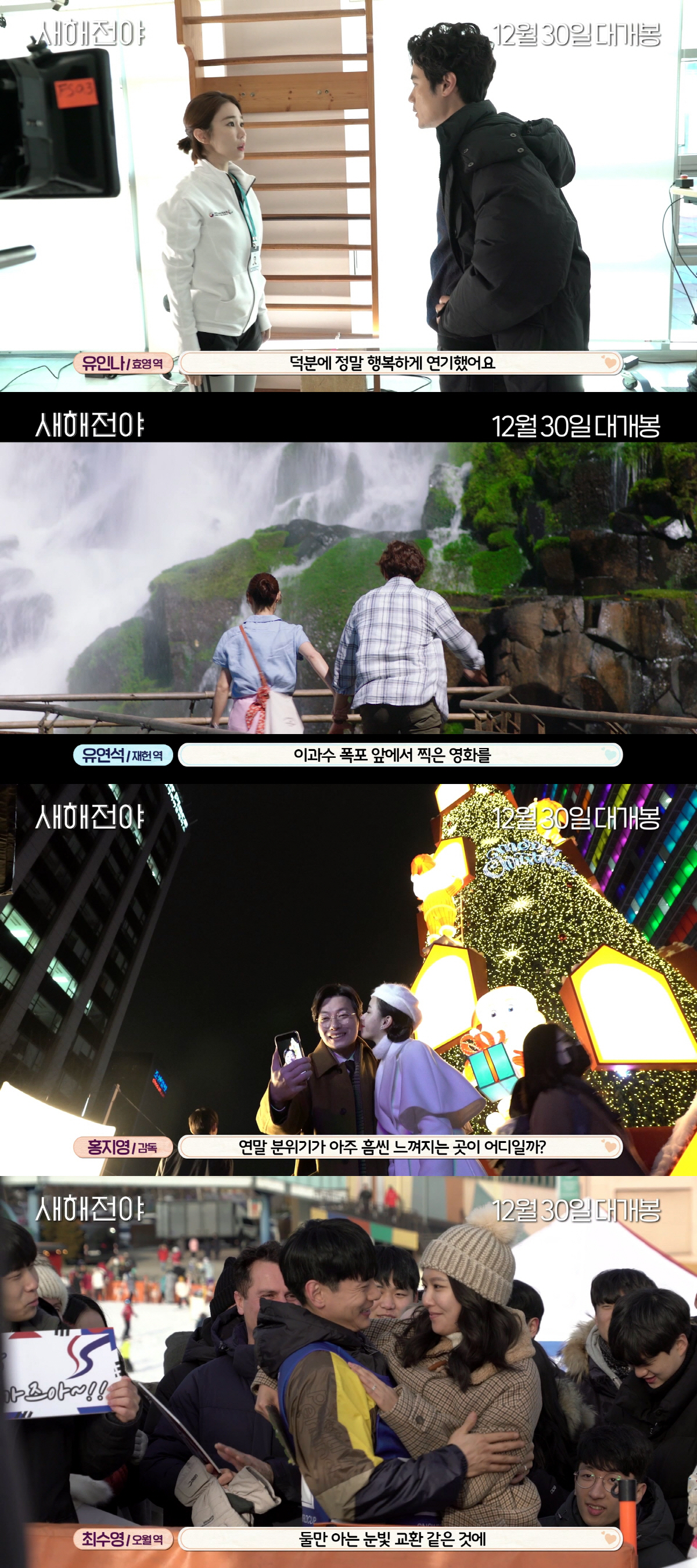 이어 '새해 설렘 포인트 400%, 네 커플의 완벽 케미스트리'에선 네 커플이 공간과 관계를 통해 하나로 얽혀 있음을 보여주고 이를 위해 힘쓴 감독과 배우들의 남다른 노력을 엿볼 수 있다. 재헌(유연석)과 진아(이연희)의 만남은 왜 아르헨티나에서 이뤄졌는지, 용찬(이동휘)과 야오린(천두링)의 서울 시내 데이트는 왜 청계천에서 진행됐는지에 대해 전했다. 특히 용찬 역의 이동휘는 국제 결혼을 앞두고 진정성 있는 사랑의 감정에 힘을 쏟았다고 전했고, 최수영과 유태오가 연기한 원예사 오월과 스노보드 국가대표 래환의 대조적인 직업 설정 속 비밀까지 공개되어 영화 곳곳에 숨겨진 재미까지 짐작케 한다.
