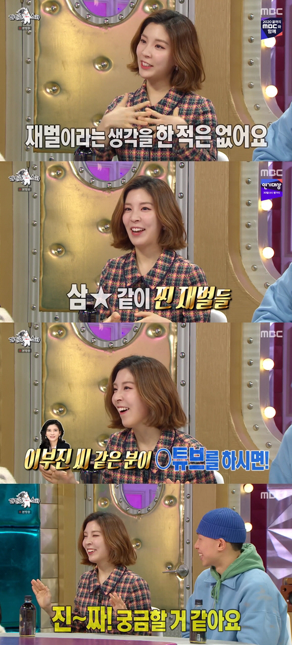 이어 함연지는 "저도 재벌들의 삶이 궁금하다. 그래서 삼성가처럼 찐 재벌들의 기사를 보면 저도 궁금하다. 제 유튜브에 많은 분들이 호기심을 가져 주듯이 이부진씨 같은 분이 유튜브를 하시면 정말 궁금할 것 같다"고 자신이 생각하는 찐 재벌들에게 유튜버 변신을 권했다. 또한 함연지는 재벌 2, 3세 모임 정체를 묻는 질문에 "전혀 없었다. 애초에 있는지도 모르겠다"고 솔직하게 답했다.