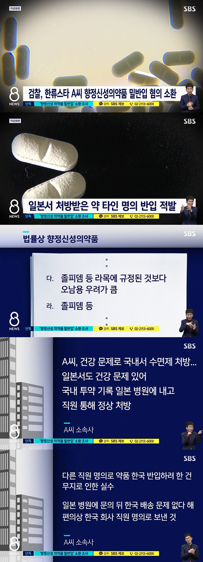 검찰 조사 결과, A씨는 소속사 일본 지사 직원을 통해 일본에서 졸피뎀 등 향정신성의약품을 처방받은 뒤 국내 직원 명의로 한국에 반입하려다 세관 검색 단계에서 적발된 것으로 밝혀졌다. 적발된 의약품에는 졸피뎀보다 오남용 우려가 심해 법률상 '다' 목으로 분류된 약품도 포함된 것으로 전해졌다.