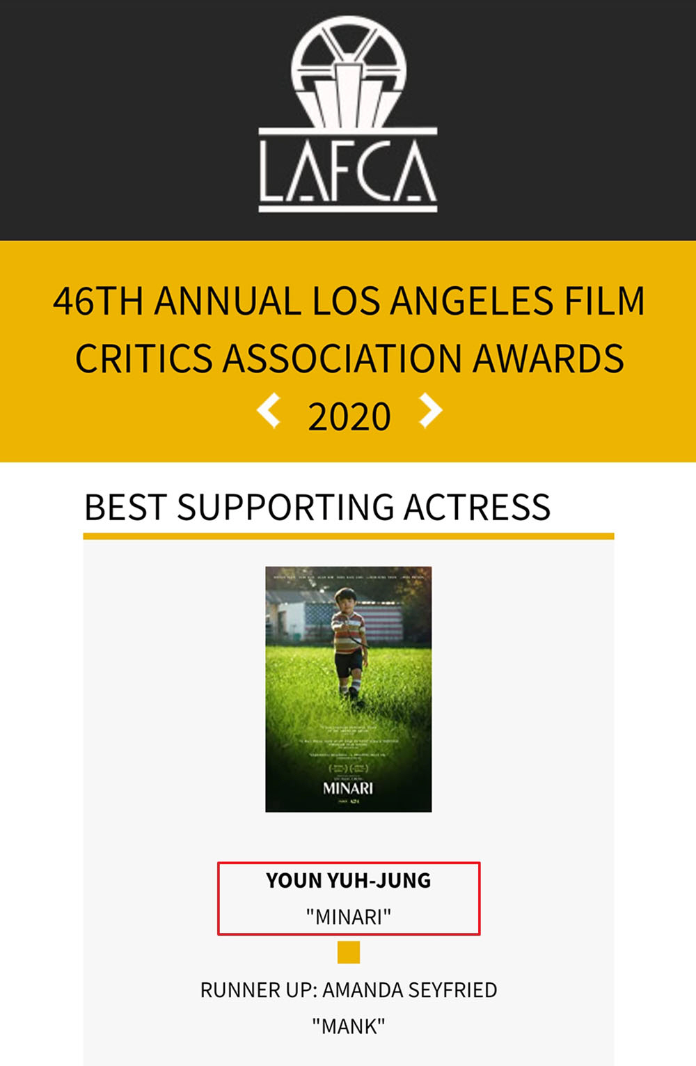 [스포츠조선 조지영 기자] 배우 윤여정이 독립영화 '미나리'(정이삭 감독)를 통해 미국 LA 비평가협회상(Los Angeles Film Critics Association Awards, LAFCA) 여우조연상 수상에 이어 보스턴 온라인 비평가협회에서 선정한 '올해의 영화 TOP10'에도 이름을 올려 화제다.