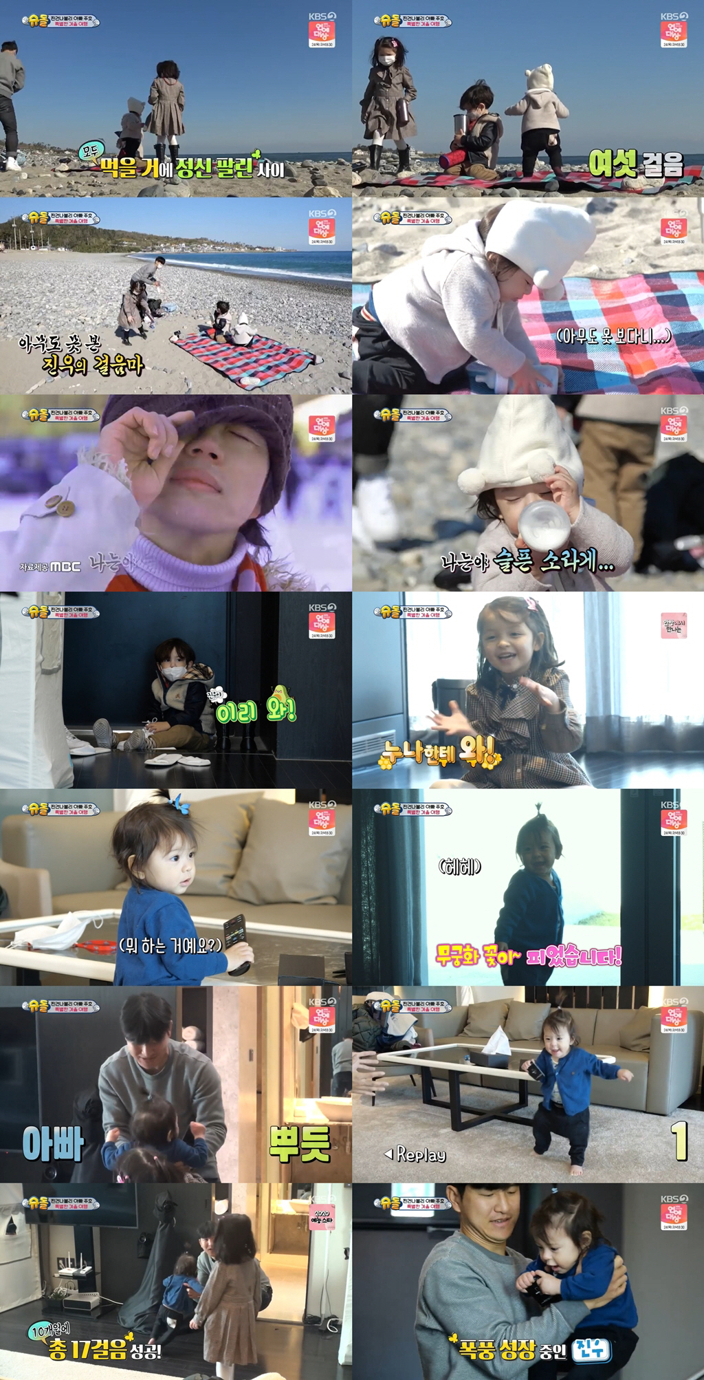 이때 아빠가 건나블리가 사 온 커피와 오징어에 집중하는 사이 혼자 걷는 진우의 모습이 '슈돌' 카메라에 포착됐다. 모래 사장에서 아장아장 여섯 걸음이나 걸은 진우지만 아무도 신경쓰지 못했다. 이에 혼자 우유를 마시던 중 쓰고 있던 모자까지 내려오며 슬픈 소라게가 된 진우의 모습이 시청자를 빵빵 터뜨렸다.