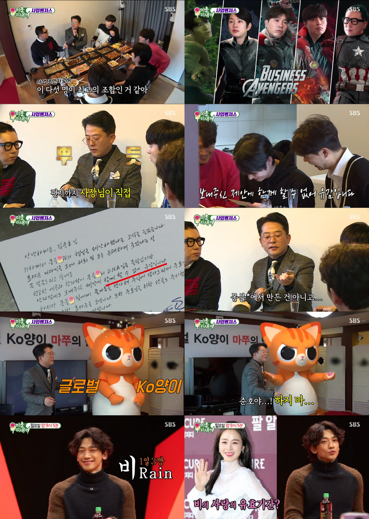 미우새 아들들은 본인의 캐릭터를 살려 오민석은 '미래를 보는 자', 김종국은 '힘을 쓰는 자', 김희철은 '생각이 없는 자', 박수홍은 '꾸준한 자', 이상민은 '빠져나가는 자(feat.빚탈출)'로 사업 어벤져스를 결성해 준호의 신규 사업 제안을 경청했다. 준호는 K-POP에 이어 K-고양이를 세계로 진출시킨다며 고양이 캐릭터 '마쭈'를 등장시켜 눈길을 끌었다. 하지만 사업 어벤져스들은 하나같이 낮은 점수를 안겨줘 준호를 실망시켰다. 이어 준호가 직접 마쭈 탈을 쓰고 나오자 "이게 더 사업성이 있다"고 너스레를 떨어 큰 웃음을 안겼다.