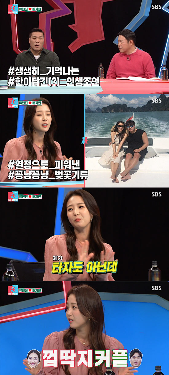 "류현진이 말을 많이하는 스타일이다"라는 말에 "연애할 땐 장거리 연애라 연애 초반에는 열정이 넘치지 않냐"라면서 "(류현진이) 연애할 때는 말이 많다가 지금은 반대가 됐다"고 전했다. 이어 배지현은 "집에 있을 때 말 한마디 하기가 어려울 정도로 과묵한 스타일이다. 마운드에서나 집에서나 표정이 똑같다. 제가 상대 타자도 아닌데, 표정을 못 읽겠다"라며 류현진의 포커페이스에 대해 이야기해 웃음을 안겼다.