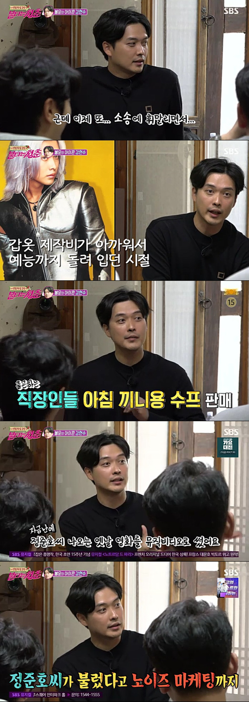 이후 V.One으로 컴백한 강현수. 강현수는 "김정민 형이랑 같은 소속사였다. 김정민 형 프로듀싱을 하느라 제 앨범을 만들 돈이 없었다"며 "정준호 씨 나오는 영화를 제 뮤직비디오로 썼다. 정준호 씨가 노래를 불렀다는 노이즈 마케팅도 했다"고 굴곡 많았던 가수 생활을 떠올렸다.