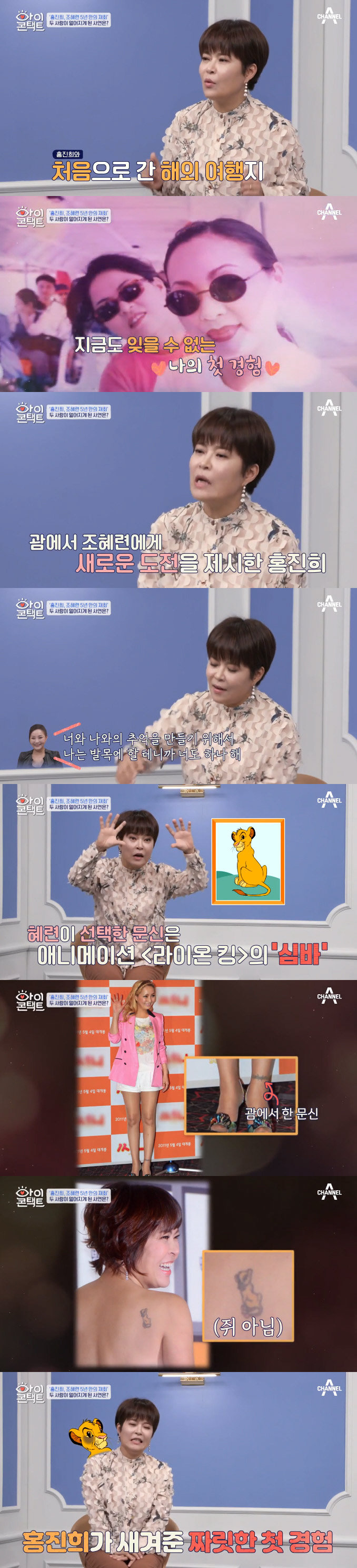 이어 "괌에서 홍진희 언니가 저한테 엄청 과감한 도전을 하게 했다. 우정 문신을 하자더라. 나는 라이언 킹의 '심바' 선택했다. 언니는 발목에 테두리 문신을 했다"고 회상했다.