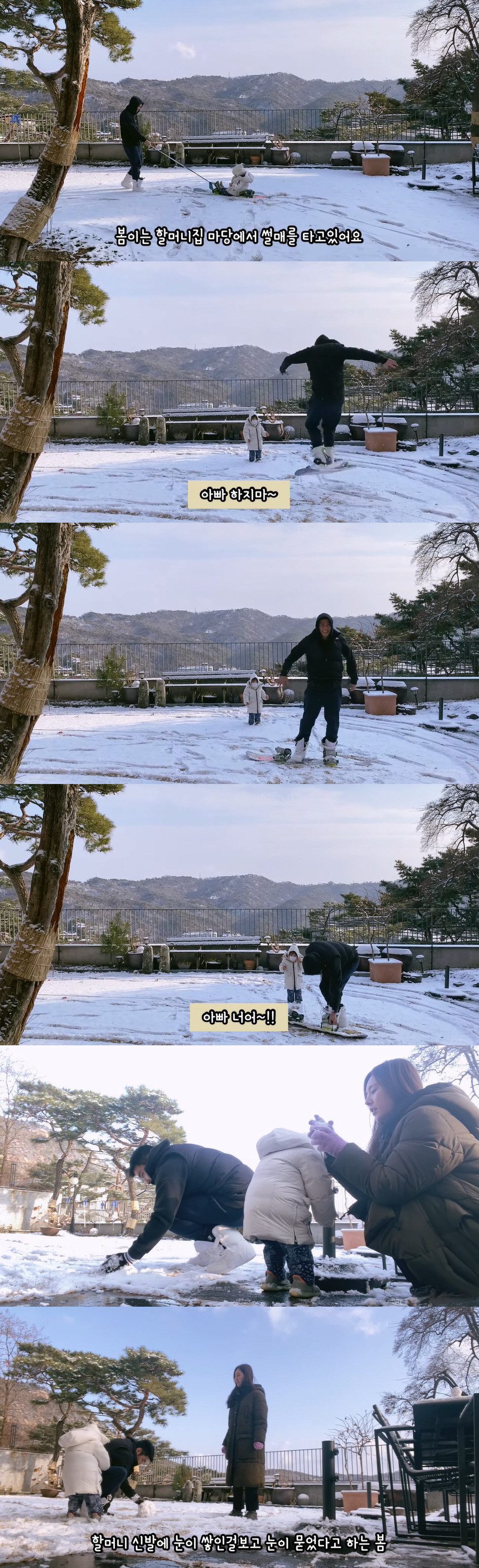 영상에는 첫눈 오던 날 한채아가 남편 차세찌, 딸과 함께 시댁에서 눈사람을 만들고 썰매를 타며 노는 모습이 담겼다. 한채아 남편은 집 마당에서 딸이 탄 썰매를 끌어주기도 하고, 직접 보드를 꺼내 들고 타는 등 딸보다 더 신난 모습을 보였다.