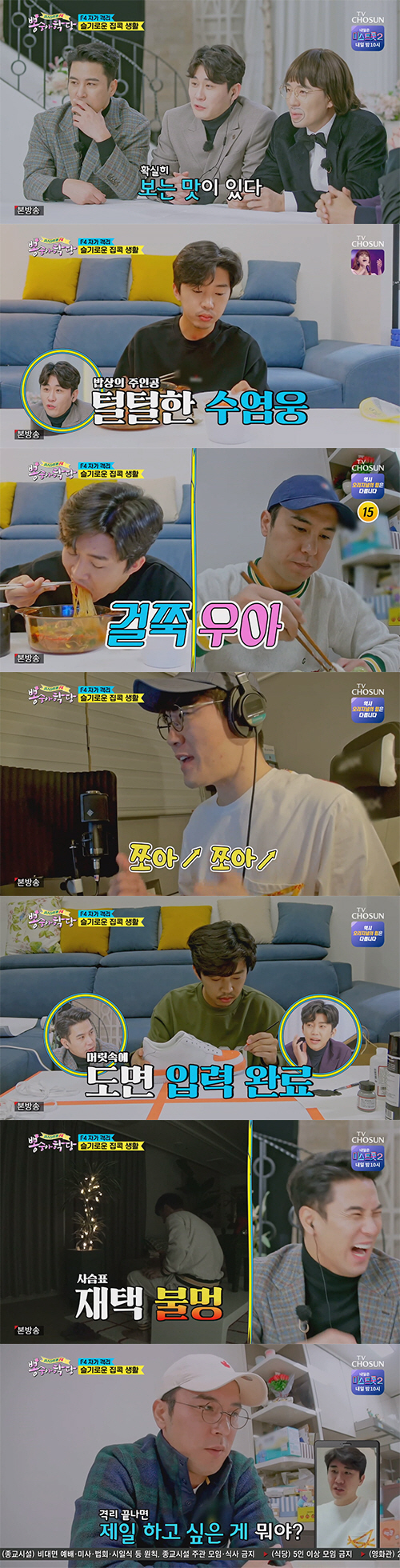 장민호와 영탁은 영상통화를 하다 "우리 같이 식사나 할까"라며 둘만의 오붓한 '랜선 식사'를 통해 우애를 다졌다. '요.알.못'이었던 영탁은 친구가 보낸 '안동 찜닭 밀키트'를 활용해 요리에 나섰지만 당면을 불리는 과정부터 좌충우돌하는 모습을 보였고, 당면을 꺼내는 모습을 본 붐은 "누구 머리채를 잡는 줄 알았다"라고 놀라는 모습을 보여 웃음을 자아냈다.