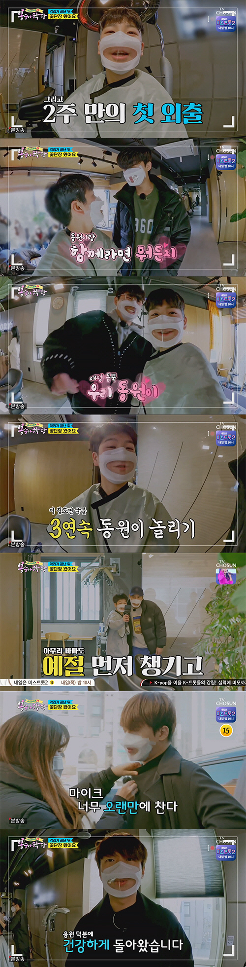 2주 만에 미용실에서 재회한 정동원과 임영웅은 서로 포옹을 하며 격하게 서로를 반겼다. 임영웅은 "2주 동안 동원이를 못 봐서 힘들었다"라고 이야기했고, 정동원은 "마음에 없는 소리를 하면 안 된다"라고 지적해 웃음을 자아냈다.