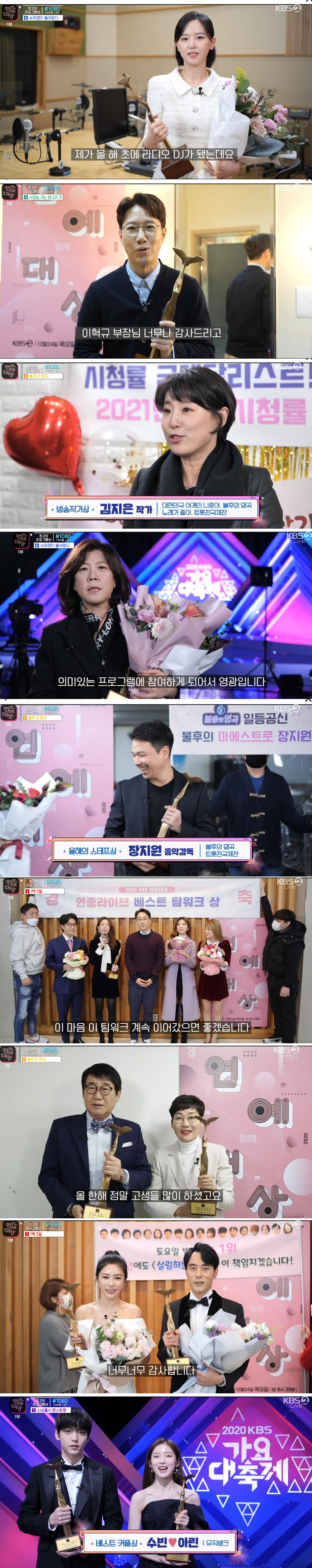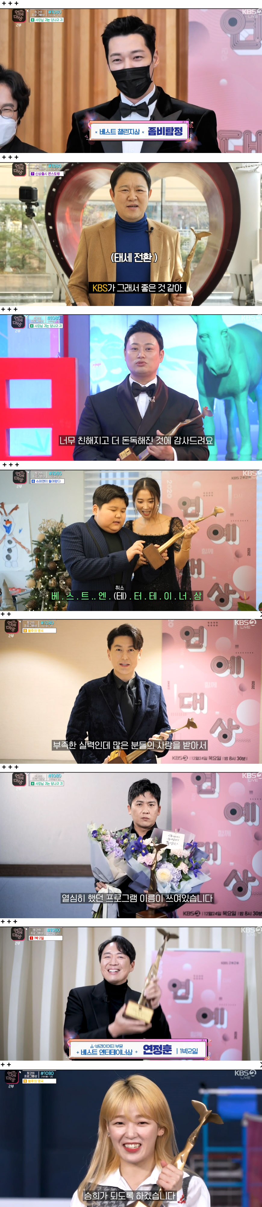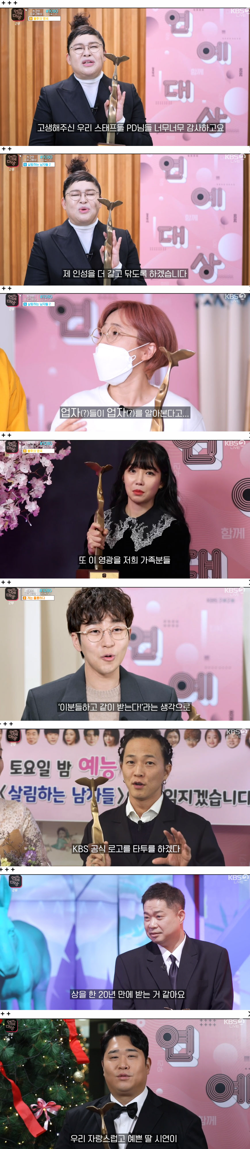 송은이는 "KBS에서 28년 째인데 KBS에서 상 처음 받아본다"면서 "피디님들이 주는 상 아니냐. 속된 말로 업자들이 업자를 알아본다고 너무 좋다"며 소감을 전했다.