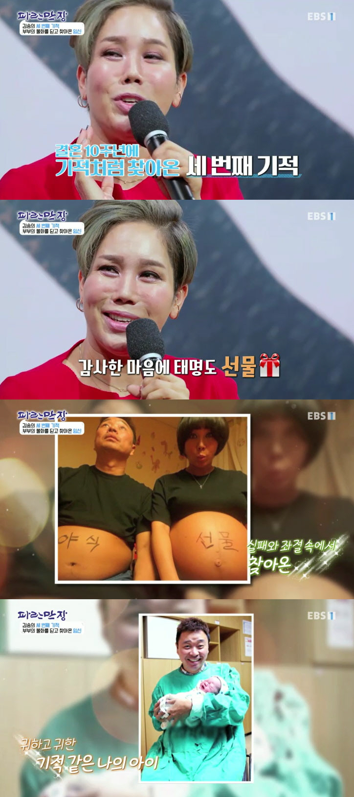 그러다 강원래의 제안으로 5년 만에 재시도 했다는 김송은 "병원에서는 이미 남편은 사고로 불임 판정을 받았었다. 남편은 기형 정자였고, 나도 늙은 난자였다. 그래서 가능성이 거의 없었다"며 "그런데 2013년 10월 12일에 병원에서 1차 혈액 검사가 성공했다가 전화가 왔다. 마침 그날이 결혼 10주년이었다. '어떻게 이런 선물이 올 수가 있지' 싶었고, 그래서 태명이 선물이었다. 우리 가정에 찾아온 기적이었다"며 행복한 미소를 지었다.