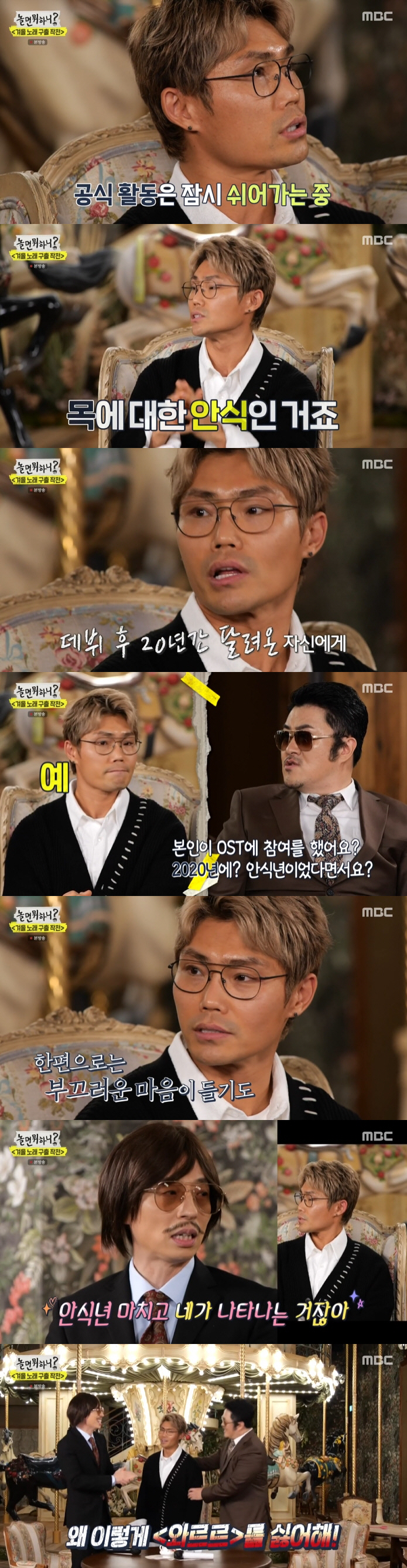 그동안 '보고 싶다', '나타나', '비가' 등 다양한 드라마 OST로 음원 차트를 휩쓴 'OST계 황제'인 김범수는 이날 최고의 OST를 뽑아달라는 말에 올해 방영한 드라마 '화양연화'의 OST '어느 날 어느 시간에'를 꼽았다. 그러나 데프콘은 안식년이라고 강조하던 김범수가 올해 OST에 참여했다는 말에 "허언증 있다"고 지적해 웃음을 자아냈다.