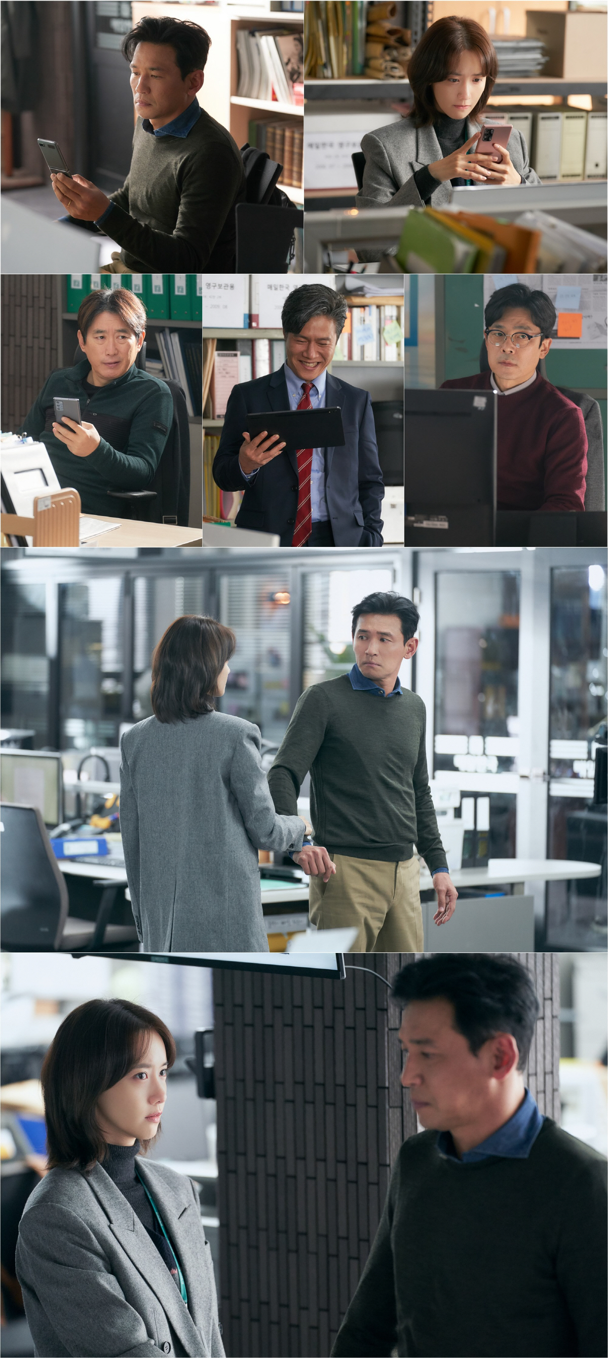이날 공개된 사진에는 '디지털 매일한국'의 출범 첫날 풍경이 담겨있다. 나성원(손병호 분) 국장의 계획으로 새롭게 태어난 디지털 뉴스부. 하지만 개편 첫날부터 일제히 휴대폰에서 눈을 떼지 못하는 매일한국 기자들의 모습이 심상치 않다. 기쁨을 만끽하는 엄성한(박호산 분)의 수상한 미소와 달리 한준혁과 이지수, 정세준(김원해 분), 김기하(이승준 분)의 반응은 냉랭하기만 하다. 특히, 입술을 굳게 다물고 화면을 노려보는 이지수의 표정이 흥미롭다. 과연, 첫날부터 디지털 매일한국을 발칵 뒤집은 뉴스는 무엇일지 호기심을 더한다. 이어진 사진에는 한준혁과 이지수의 달라진 분위기도 포착됐다. 어디론가 향하는 한준혁을 붙잡은 이지수, 한준혁의 싸늘한 얼굴과 대비를 이루는 그의 붉어진 눈시울이 이목을 집중시킨다.
