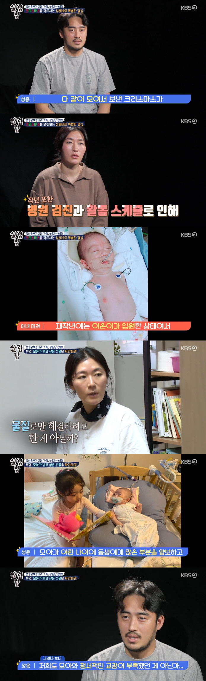 한편 아이들을 재우고 휴식을 취하던 김미려는 정성윤으로부터 영상 편지를 선물로 받았다. 정성윤은 "우리 이온이가 태어나고 나서 첫 크리스마스를 같이 못 보내지 않았냐. 이온이가 중환자실에 있을 때 함께하지 못했는데 올해는 이렇게 우리 가족 건강하게 크리스마스를 보내게 돼서 너무 감사하고 참 행복하다"며 "앞으로 우리 가족 행복하게 잘 지내자. 나도 옆에서 많은 힘이 될 수 있도록 하겠다. 사랑해"라며 눈물을 흘렸다.