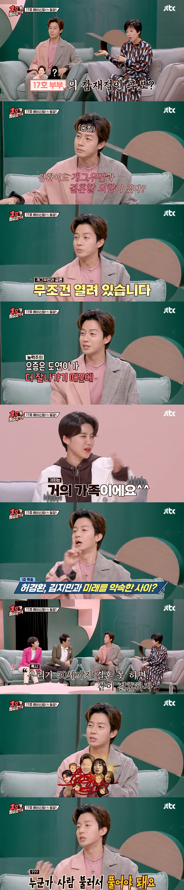 윤형빈을 향해 강한 일침을 날린 허경환은 자신의 결혼 가능성에 대해서도 언급했다. 박미선은 허경환을 향해 "여자 개그우먼 사이에서 경환씨 인기가 하늘을 찌른다. 17호 부부의 잠재적인 후보가 될 수 있다"고 했다. 그러며 "여자 개그우먼과의 결혼은 어떠냐"고 물었고, 허경환은 "이 프로그램에 나오고 싶었던 이유가 재미있는 결혼이 이뤄지는 게 너무 좋다. (개그우먼과 결혼) 무조건 열려 있다"고 솔직히 털어놨다.