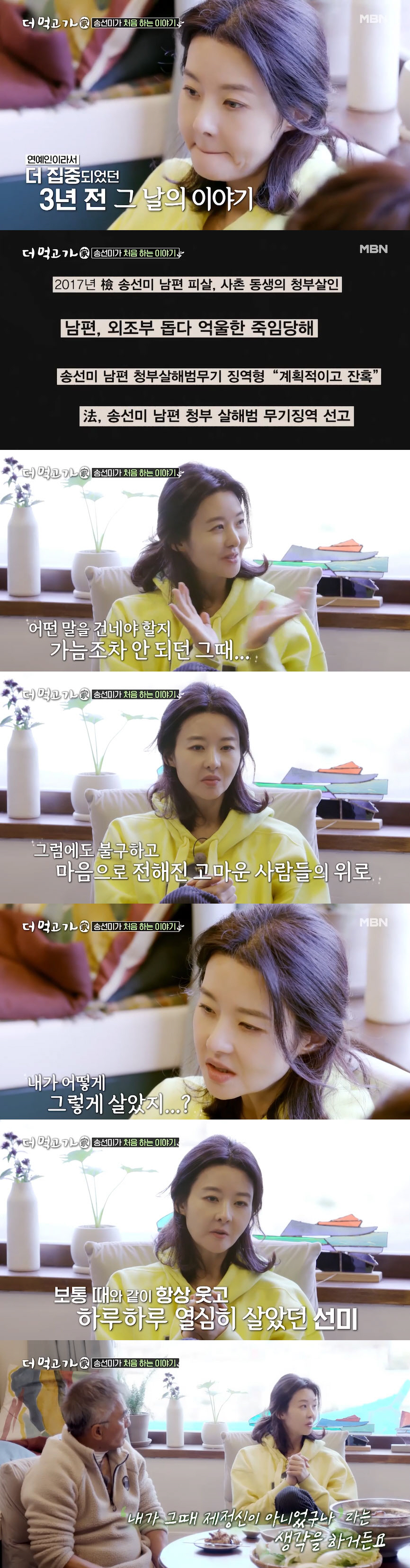 특히 송선미는 "남편과 함께 살 때 나중으로 미뤄둔 일들이 많았는데 그게 후회됐다. 그런 일을 겪고 나니까, 삶의 관점이 달라졌다"며 "예전에는 목표를 갖고 살았다면 내일 어떤 일이 일어날지 모르니까, 이제는 현재의 삶에 충실하고 그 안에서 행복을 느끼며 살려고 한다"고 사별 후 달라진 인생관을 고백했다.