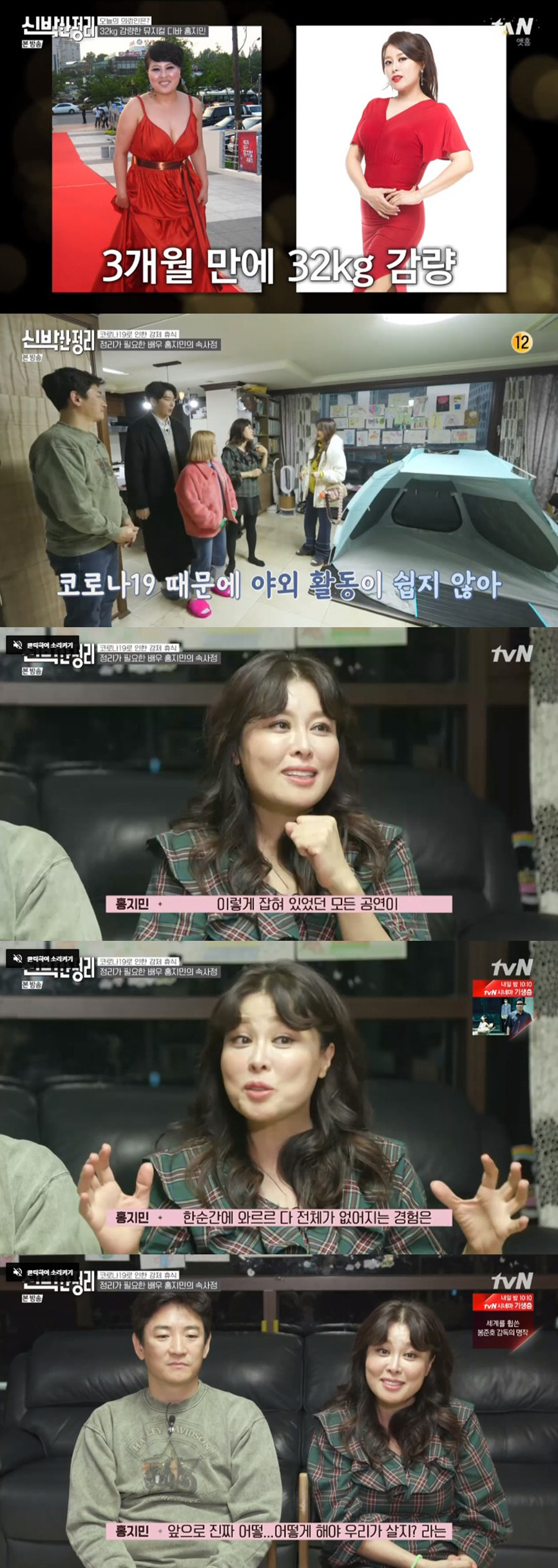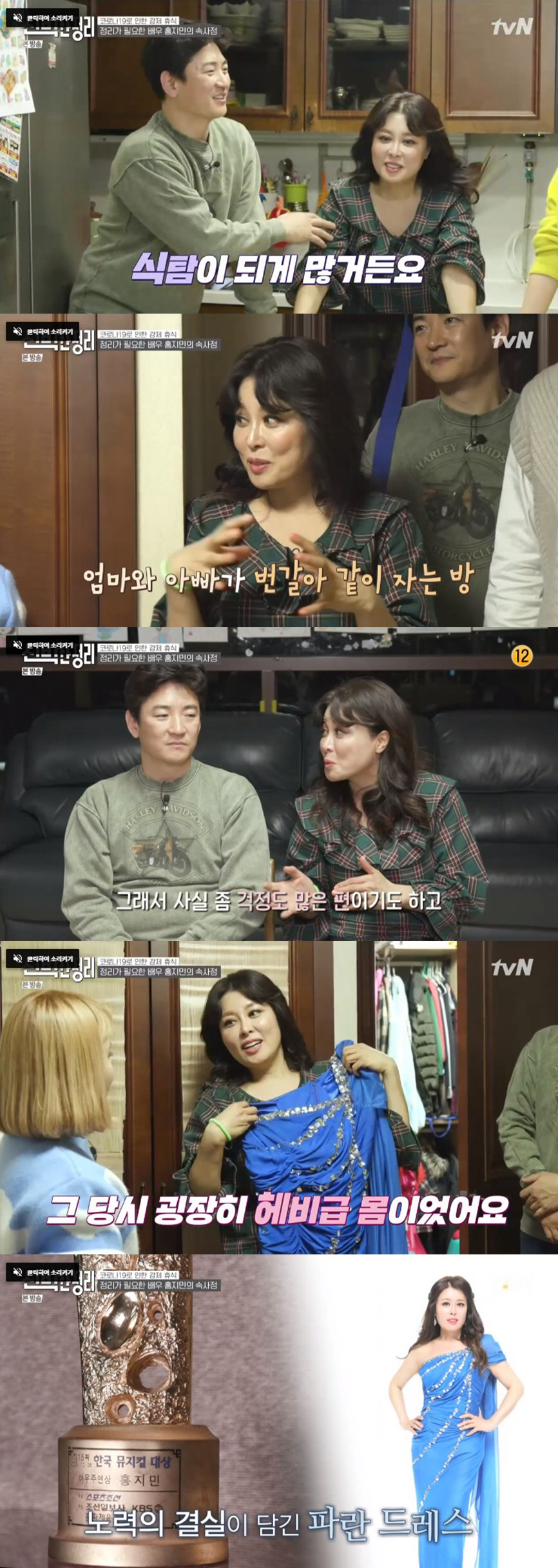 홍지민은 요즘 고민에 대해 "코로나19 때문에 공연이 다 취소됐다. 상반기에 '맘마미아' 7개월 프로젝트가 취소됐다. 저희 신랑도 요식업을 한다. (상황이) 안 좋다. 신랑도 너무 힘들다"며 "본의 아니게 집에 있는 시간이 많아져서 정리를 해야겠다 해서 하는데 해도 해도 끝이 없다. 바깥 일은 엄청 잘했는데 가정주부로서는 조금 서툴더라"라고 토로했다.