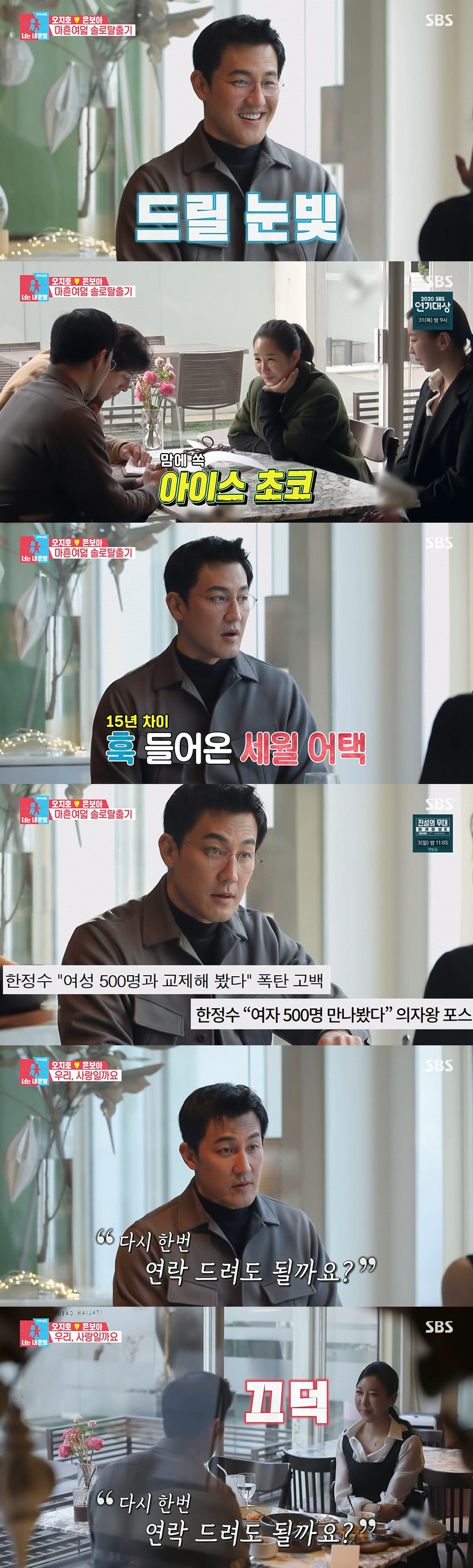 어색한 분위기 속에 소개팅 상대는 "기사를 찾아봤는데 여자 500명과 사귀었다는 걸 봤다"며 궁금해했다. 그러자 한정수는 "그건 과장된 거다"라며 "3년 전 연애를 마지막으로 연애 전혀 못 하고 있다"며 묻지도 않은 과거 연애사까지 털어놨다. 이에 멀리서 두 사람을 지켜보던 오지호와 은보아는 "갑갑하다"며 한숨 쉬었다.