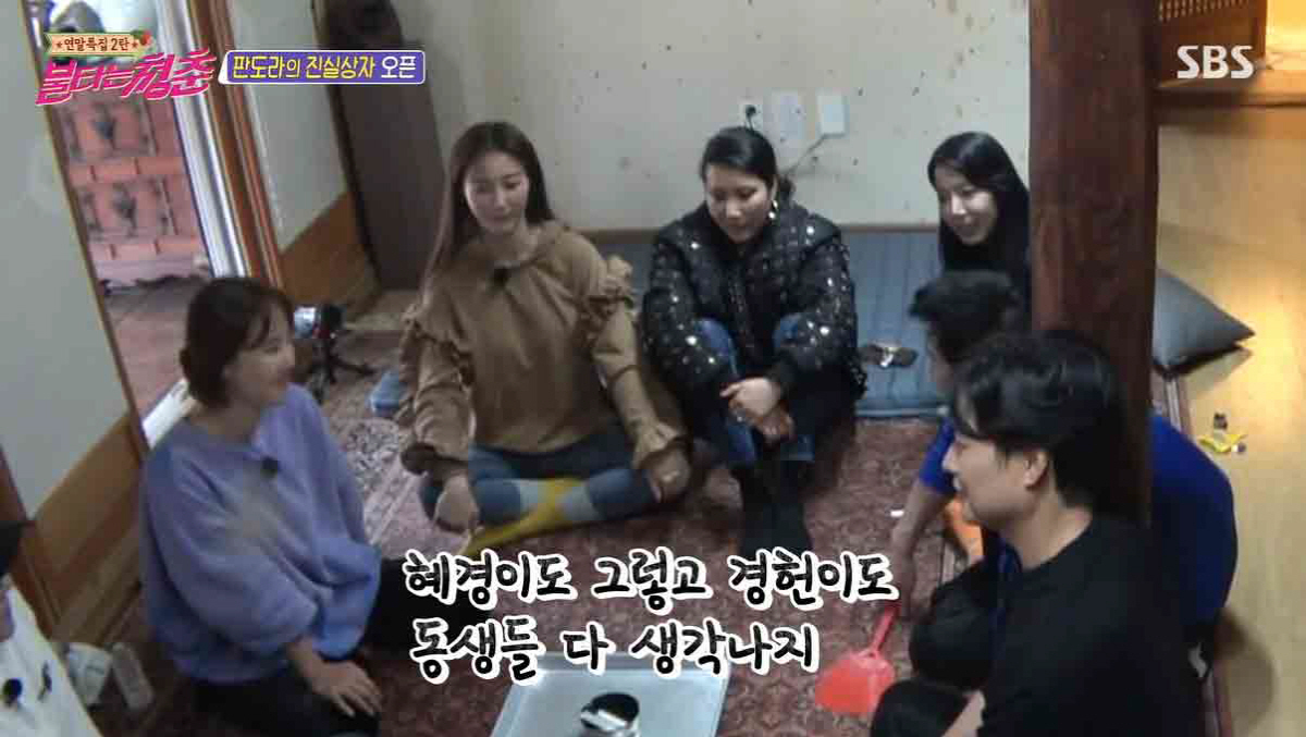 이날 청춘들은 부슬부슬 비가 오는 밤 추억의 프로그램 '동거동락' 게임이 펼쳤다. 유재석 MC 자리에 김부용이 자리하고 잘생긴 팀과 못생긴 팀으로 나눠 치열한 게임이 펼쳐졌다.