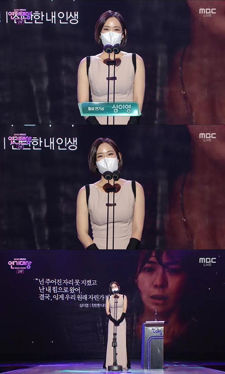 황금 연기상 시상은 지난해 최우수상 수상자였던 예지원이 맡았다. 단독 후보였던 황금 연기상은 '찬란한 내 인생'의 심이영이 수상했다. 심이영은 "지금 전 세계가 힘들고 어려운 시기를 지나가는 이 때 저희도 '내일은 촬영을 나갈 수 있을까' 걱정하며 촬영에 나갔다"고 떠올리며 지금 이 순간을 기적으로 표현했다. 심이영은 '찬란한 내 인생' 스태프들과 배우들에게 고마움을 전했다. 이어 "한해 한해 일을 해나가면서 늘 감사한 마음을 가지는 분들이 늘어나고 있다"며 특히 우리 가족들에게 너무 고맙다. 우리 아기들, 저를 응원해줄 수 있는 만큼 자라서 고맙다. 항상 밤낮으로 우리를 위해서 당신, 늘 고맙게 생각한다"고 남편 배우 최원영도 언급했다.