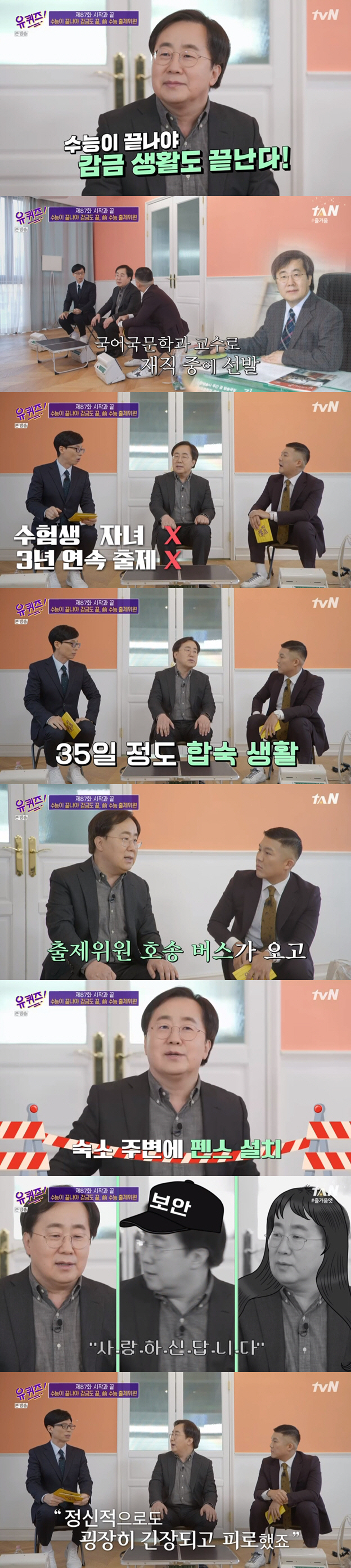 한달 정도 합숙 생활을 하며 수능 문제를 출제한다고. 강상희 자기님은 "집합 장소와 일시에 맞춰 모이면 호송 버스를 타고 합숙소로 향한다. 국어 영역은 출제 위원만 30명, 검토 위원만 20명이 모였다. 출제위원뿐만 아니라 외국인 성우, 보안 요원분들도 같이 감금된다"며 "숙소 주변에 펜스를 설치한다. 그 밖으로는 한발작도 못나간다. 내부에 병원도 다 있다. 인터넷 검색도 보안요원들이 지켜보는 가운데서 검색하고, 외부와 통화도 하면 안된다. 만약에 가족과 통화를 해야하면 보안요원들이 대리로 통화 내용을 전달해준다. 숫자는 금지어다. 암호화해서 전달할 수 있기 때문에 차단하는거다"고 규칙 사항을 자세하게 전했다.