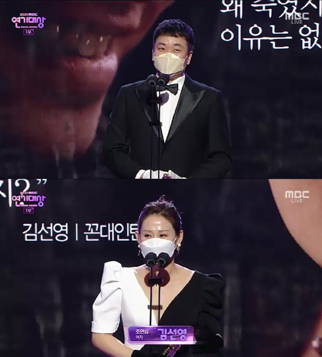 여자 조연상은 '꼰대인턴'의 김선영이 차지했다. 유쾌하게 무대에 오른 김선영은 "제가 6년 전에 드라마를 처음 했는데 그게 MBC였다. MBC에서 같이 했던 감독님들이 생각이 난다"며 "'꼰대인턴'을 한다고 했던 이유는 김응수 선배님 때문이었다. 김응수 선배님과 같이 연기 해보고 싶었다. 오랜만에 만나니까 너무 좋다"고 김응수에 대한 애정을 드러냈다. 김선영은 "좋은 연기를 할 수 있도록 노력을 계속하겠다. 상 주셔서 감사하다. 우리 딸 사랑합니다"라며 행복한 소감과 함께 무대를 내려왔다.