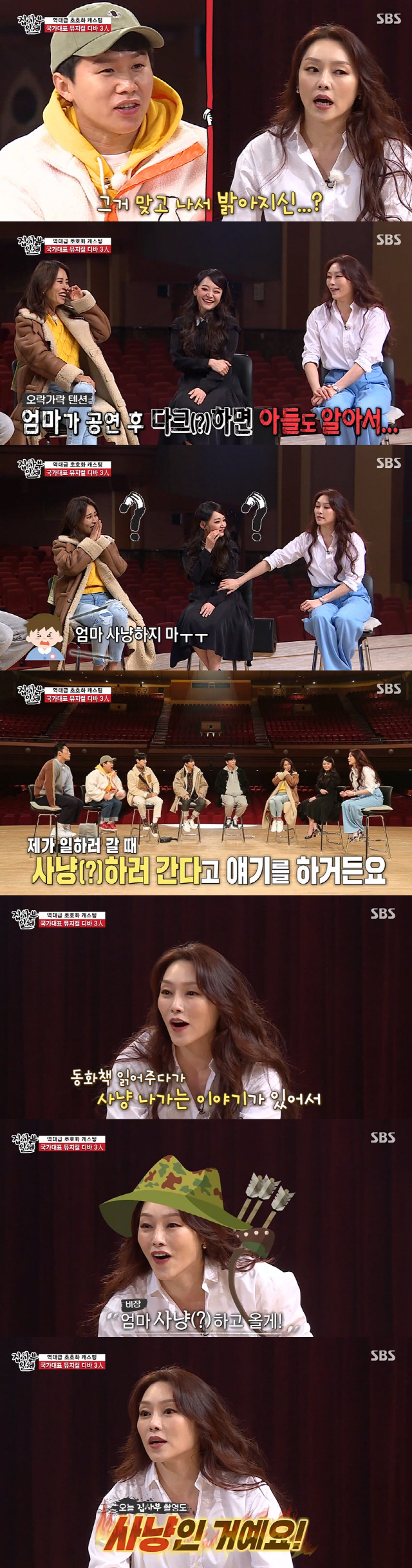 그때 이승기는 "자녀분에게는 어떤 식으로"라고 물었고, 차지연은 "내 감정에 따라 다르다. 엄마가 좀 다크하다 하면 아이도 알기 때문에 '엄마 사냥하지 마' 한다"고 말했다. 그는 "일하러 갈 때 '사냥하러 간다'고 이야기를 한다"며 "동화책 읽어주다가 사냥 나가는 이야기가 있더라. 아들한테 '엄마 아빠도 사냥을 해서 돈을 벌어야 맛있는 것도 사주고 장난감도 사주고 그러는거다'고 했다. 그 다음부터 아들이 '엄마 사냥 가요?' 그런다. 오늘도 사냥인 거다"고 설명해 웃음을 안겼다.