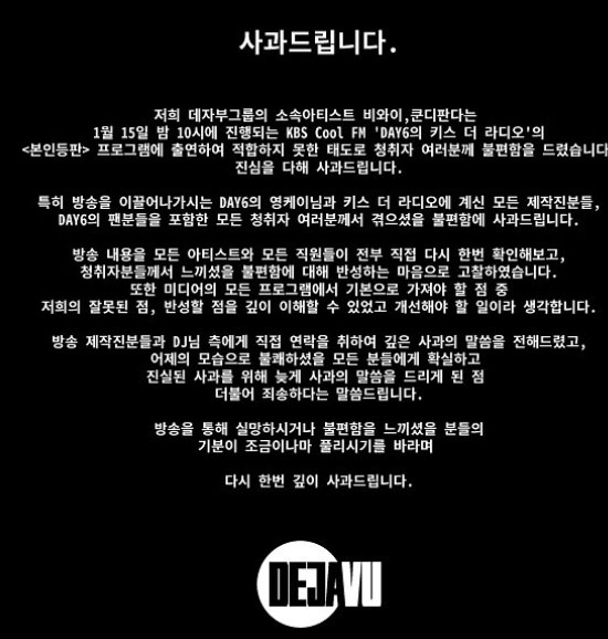 저희 데자부그룹의 소속 아티스트 비와이, 쿤디판다는 1월 15일 밤 10시에 진행되는 KBS Cool FM 'DAY6의 키스 더 라디오'에 소속 아티스트 비와이, 쿤디판다가 <본인등판> 프로그램에 출연하여 적합하지 못한 태도로 청취자 여러분께 불편함을 드렸습니다. 진심을 다해 사과드립니다"라고 운을 뗐다.