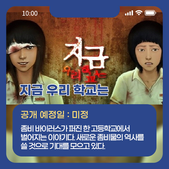 아무래도 가장 기대되는 작품은 '킹덤 : 아신전'이 아닐까 합니다. 전지현 주연의 이번 작품은 최근 야외 촬영장인 경북 문경 세트장에서 불이나 화제가 되었습니다. 다음으로 '종이의 집' 시즌 5와 6월 방영예정인 '키싱부스' 시즌 3, 좀비물의 새역사를 쓸 것으로 기대되는 '지금 우리 학교는'이 차지했습니다. 역시 시즌제로 선보이고 있는 '기묘한 이야기'의 시즌4가 그 뒤를 이었고, 마지막으로 공유, 배두나 등 초호화 출연진으로 화제를 모으고 있는 '고요의 바다'가 기대작으로 손꼽히고 있네요.