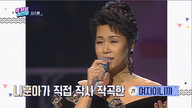 심수봉은 스카이라운지에서 아르바이트를 하다가 나훈아의 눈에 띄어 음반사 사장님과 인연을 맺었다. 나훈아가 직접 작사 작곡한 '여자이니까'까지 선물했다.