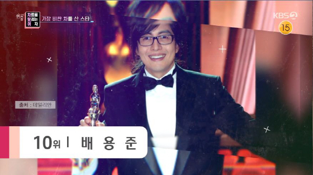 10위는 바로 배우 배용준. '겨울연가'의 주인공 배용준은 실제로 세계 3대 명차 중 하나인 독일 M사의 럭셔리 세단이었다. 차 한 대 가격이 무려 7억 8천만 원이라고. 전체 공정 수작업으로 인해 하루 3대 밖에 제작되지 않는다. 박수진과 결혼식에 웨딩카로 사용되기도 했다.