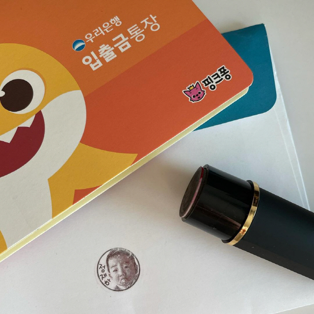 공개된 사진 속에는 새로 개설한 통장의 사진과 아이들의 얼굴이 그려진 도장이 눈길을 끈다.