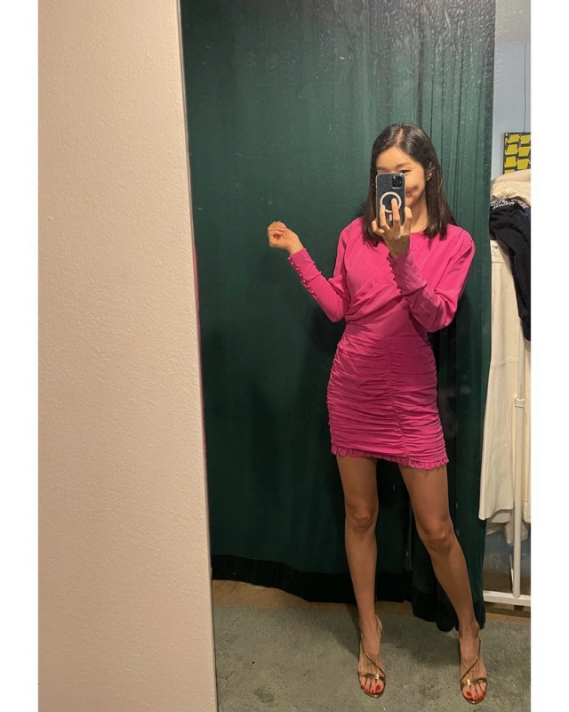 김빈우는 31일 자신의 인스타그램을 통해 "예쁜 옷 입으면 기분 좋아짐 #날씨도 좋고 #기분도 좋고 #행복"이라는 글과 함께 한 장의 사진을 게재했다. 공개된 사진 속에는 탈의실에서 옷을 갈아입은 김빈우의 모습이 담겼다. 김빈우는 핫핑크색 미니 원피스도 완벽하게 소화해냈다. 40kg대에 진입했다고 밝힌 김빈우의 늘씬한 각선미가 돋보인다.