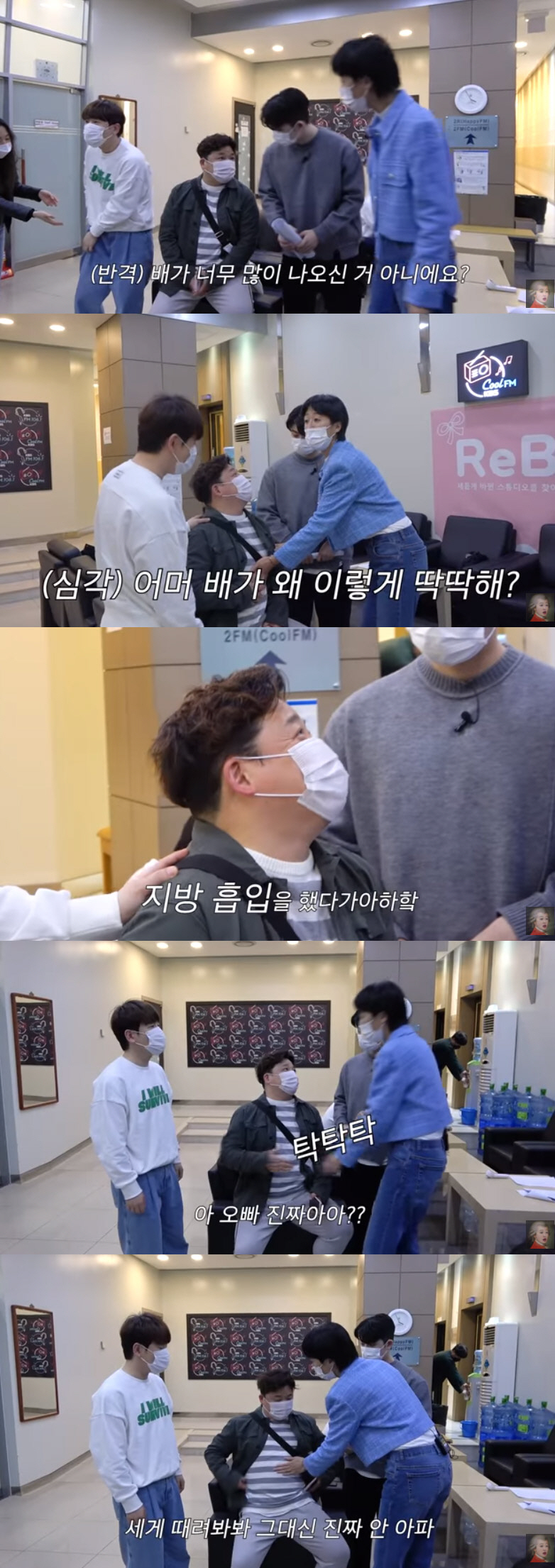 윤정수는 "15년 전에 지방 흡입을 했다가 관리를 똑바로 안 해서 배가 딱딱해졌다. 세게 때려봐라. 진짜 안 아프다"라고 자폭해 모두를 웃기게 했다.