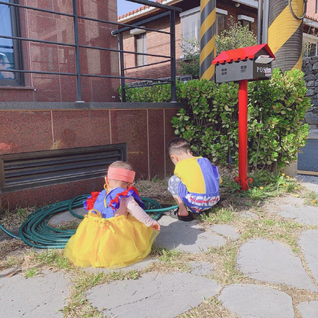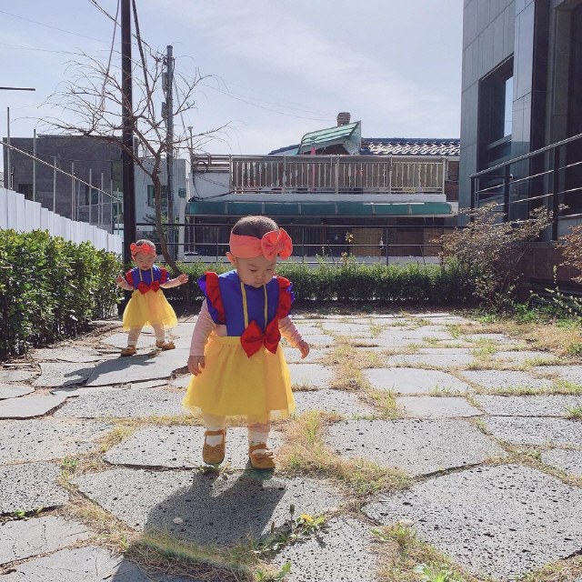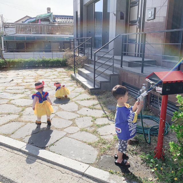 사진 속에는 집 마당에서 즐거운 시간을 보내고 있는 삼남매의 모습이 담겨있다. 물 놀이 중인 재율 군과 걷고 있는 쌍둥이 아린, 아율 양. 이때 무언가를 유심히 관찰 중인 남매의 뒷 모습이 사랑스럽다. 또한 백설공주 원피스에 큰 머리띠를 착용한 쌍둥이의 모습은 보는 이들까지 절로 미소를 짓게 하는 귀여움 가득한 모습이었다.