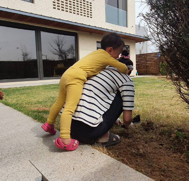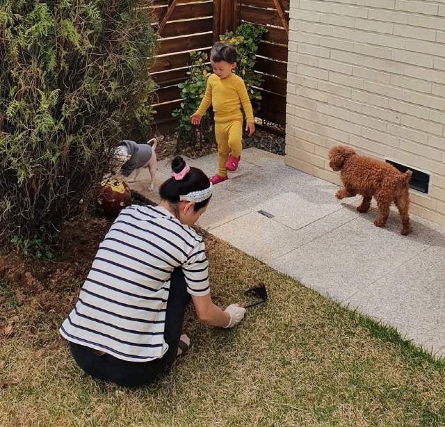 사진 속에는 윤상현이 촬영한 메이비와 아들 희성 군의 모습이 담겨있다. 마당에서 호미를 들고 열일 중인 메이비. 이때 막내 아들 희성 군은 노란색 의상을 착용, 엄마 곁에서 반려견들과 즐거운 시간을 보내고 있다.