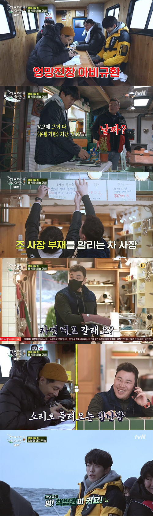 차태현은 주방 앞에 '조사장 부재중 신선한 재료를 구하기 위해 동해바다로 나갔습니다'라고 안내판을 붙였다. 특히 안내판에는 '실시간 조업상황'까지 적혀있어 웃음을 자아냈다.