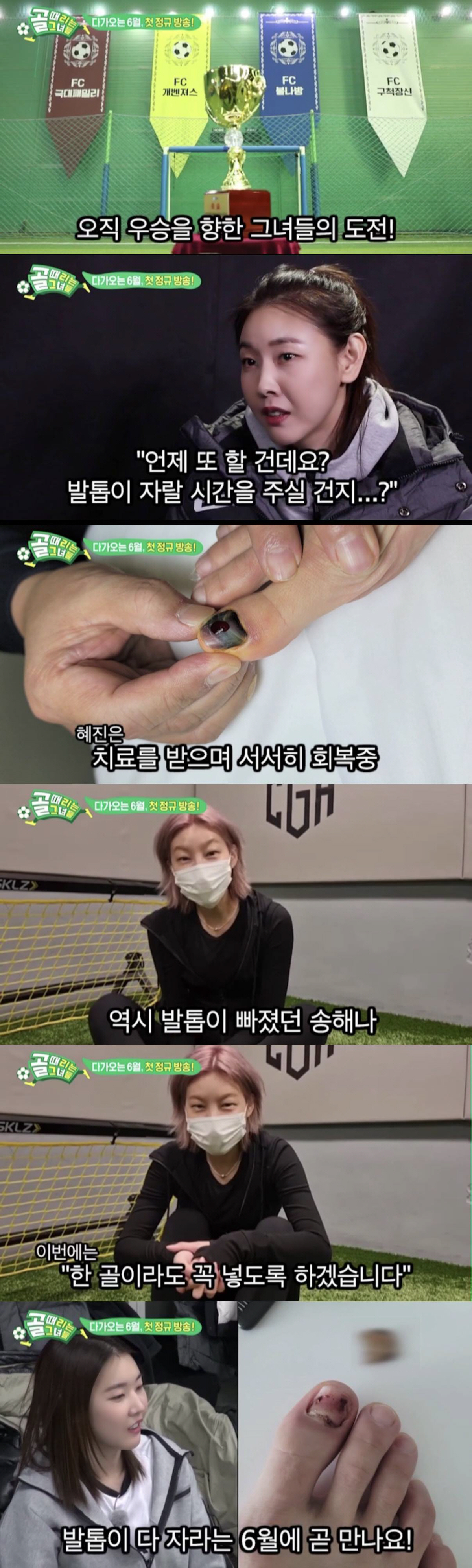 그 중 'FC 구척장신' 팀 주장으로 활약했던 한혜진은 지난 경기에서 엄청난 승부욕을 발휘하면서 열정적으로 뛰다가 엄지 발톱 부상을 호소한 바 있다. 부상을 안은 채 끝까지 경기를 뛰었던 한혜진은 SNS를 통해 '골때녀' 출연 당시 축구 경기를 뛰다가 까맣게 변색된 엄지 발톱을 공개해 안타까움을 자아내기도 했다.