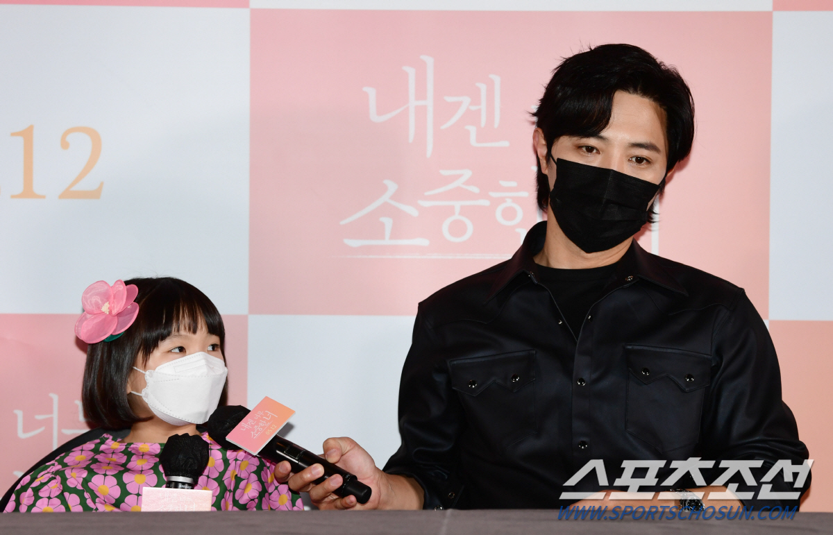 배우 진구와 정서연이 27일 건대 롯데시네마에서 열린 영화 '내겐 너무 소중한 너' 언론시사회에서 인사말을 하고 있다. 영화는 돈만 빼고 무서울 거 없던 '재식(진구)'이 듣지도 보지도 못하지만 손끝으로 세상을 느끼는 아이 '은혜(정서연)'의 가짜 아빠를 자처하면서 시작된 특별한 만남을 다룬 이야기다. 건대=최문영 기자 deer@sportschosun.com /2021.04.27/