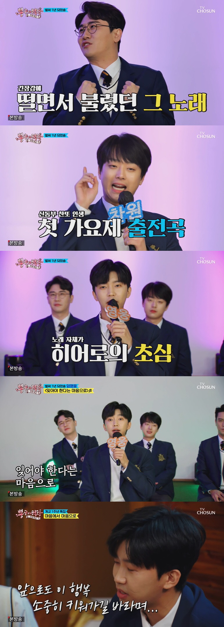 퀴즈 대결 후엔 '뽕숭아학당'의 1년을 돌아봤다. 장민호는 부모님을 모시고 노래했을 때와 장윤정이 출연했을 때가 가장 기억에 남는다고 꼽았다. 이찬원은 엄마와의 눈물의 영상통화를 떠올렸다.