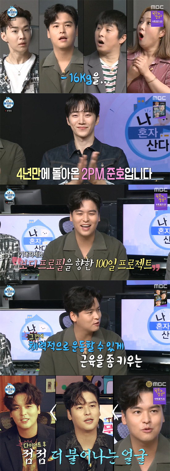준호는 "16kg 빠졌다"고 밝혔다. 준호는 아침에 일어나 상의 탈의한 근육질 모습을 공개해 제작진의 "진짜 짐승으로 컴백"이라는 자막을 유도했다.