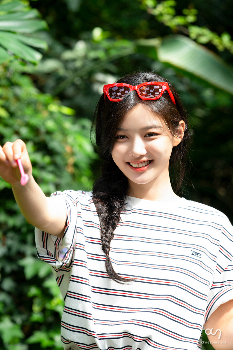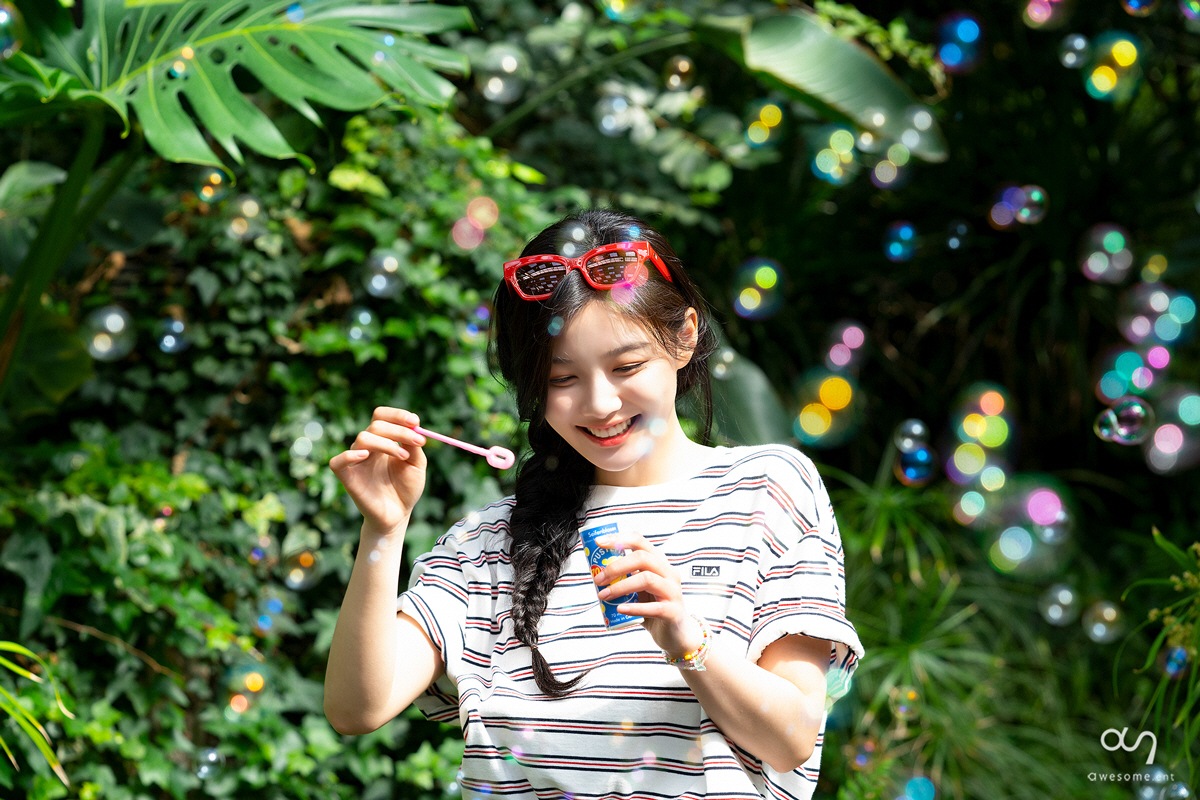 화보 촬영 당시 김유정은 선글라스, 비눗방울, 과일 등 소품까지 자유자재로 활용하며 화보 장인의 면모를 드러냈다는 후문. 꽃송이를 살짝 쥐고 있는 컷은 휴양지에 온 것만 같은 느낌을 주는가 하면, 비눗방울을 가지고 노는 천진난만한 모습은 어린 시절의 동심을 느끼게 하기도. 양손에 과일을 들고 함박웃음을 짓고 있는 모습은 화면으로도 비타민을 섭취하는 것 같은 상큼함을 전달했다.